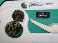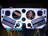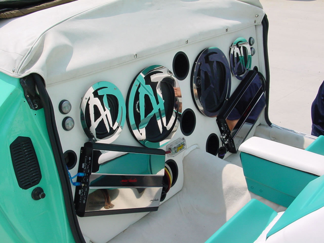 Dopo aver progettato la parte posteriore della vettura ha dato sfogo alla sua creatività per la costruzione del pannello sul quale sono stati posizionati: 2 subwoofer da 320mm che possono erogare una potenza di 1200W, 2 mdi.woofer da 200mm, 2 amplificatori MacAudio 4 canali da 1200W e 2 coppie di tweeter da 25mm. |