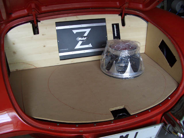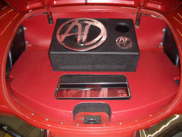 L'unica parte visibile dell'impianto è l'alloggiamento del sub-woofer. Pedro è stato in grado di ridisegnare completamente l'intero baule ospitando il potentissimo sub-woofer da 320mm firmato MacAudio e il magnifico amplificatore MacAudio 4200 capace di erogare 1500W. |
