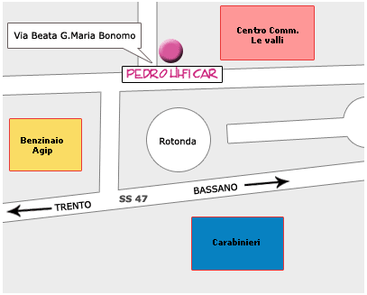 Uscire a Padova ovest direzione Bassano; a destra proseguire per 40 km circa ed arrivati a Rosà girate a destra per Trento; proseguite quindi fino ad arrivare all'uscita di Castelnuovo e alla rotatoria girate a sinistra sulla strada statale 47 fino all'entrata di Borgo Valsugana;entrate in Corso Vicenza per 150 m, infine girate a destra in Via Beata Giovanna Maria Bonomo. |